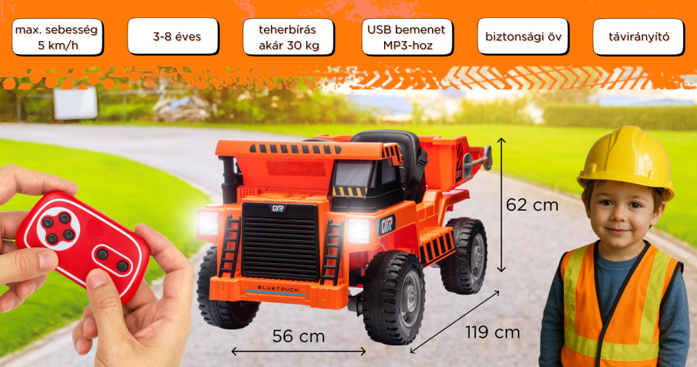 A BLUETOUCH gyermek elektromos dömper ideális választás a 3 és 8 év közötti kis sofőrök számára, akik minden utazás során élvezhetik a szórakozást és a biztonságot. A 300 W-os teljesítmény, 3 sebességfokozat és a távirányítós vezérlés révén a gyerekek akár 2 órán keresztül is zavartalanul közlekedhetnek. A kényelmes bőrülés, és az MP3-hoz használható USB bemenet kiváló szórakozást nyújt minden utazás során. A biztonsági elemek, mint a hárompontos biztonsági öv és a rugózott kerekek, kényelmes és biztonságos utazást biztosítanak. Emellett praktikus rakodótérrel is rendelkezik apró tárgyak és játékok szállítására. Több